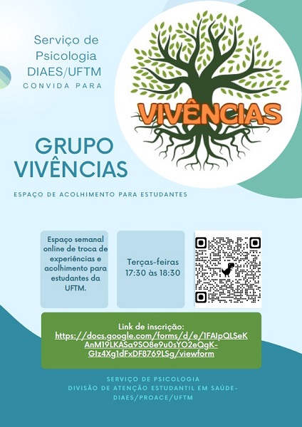 O “Grupo Vivências”, formado pela equipe de Psicologia da Divisão de Atenção Estudantil em Saúde - DIAES, da Pró-reitoria de Assuntos Comunitários e Estudantis – PROACE, convida a todos os estudantes de graduação, pós-graduação e cursos técnicos da UFTM, para participarem dos encontros.