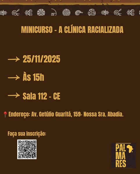 A palestra “A importância da questão racial para a formação profissional” será hoje, 24 de novembro, às 19 horas, e o minicurso “A clínica racializada”, será amanhã, 25 de novembro, às 15 horas.