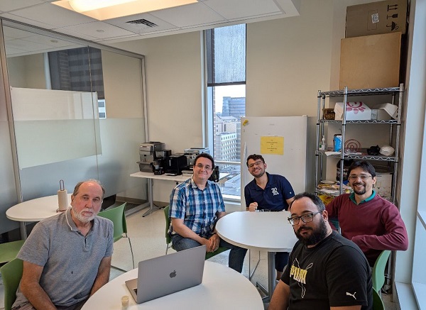 Coautores do artigo do PNAS no CTBP: Antonio Oliveira Jr. (blusa preta), Jose Onuchic (blusa cinza), Vinicius Contessoto (blusa xadrez), Ronaldo Olveira (blusa vermelha) e Matheus Mello (blusa azul)