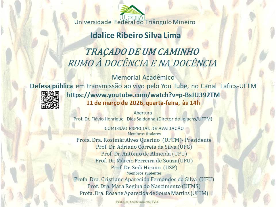 O Departamento de Filosofia e Ciências Sociais do Instituto de Educação, Letras, Artes, Ciências Humanas e Sociais (IELACHS/UFTM) convida toda a comunidade acadêmica para acompanhar a defesa pública do memorial da docente Idalice Ribeiro Silva Lima.