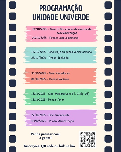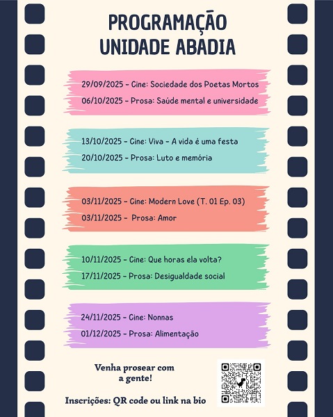 Os encontros serão divididos entre exibição de filmes, episódios de série e/ou documentários com temas diversos, e rodas de conversa. Os encontros serão realizados nas unidades Abadia (sala 201 do Centro Educacional) e Univerdecidade (sala H 202). Os encontros na Unidade Abadia acontecerão às segundas-feiras, das 17h às 19h, iniciando dia 29/09/2025 e finalizando no dia 1/12/2025. Os encontros na Unidade Univerdecidade acontecerão às quintas-feiras, das 17h às 19h, iniciando dia 2/10/2025 e finalizando no dia 4/12/2025.