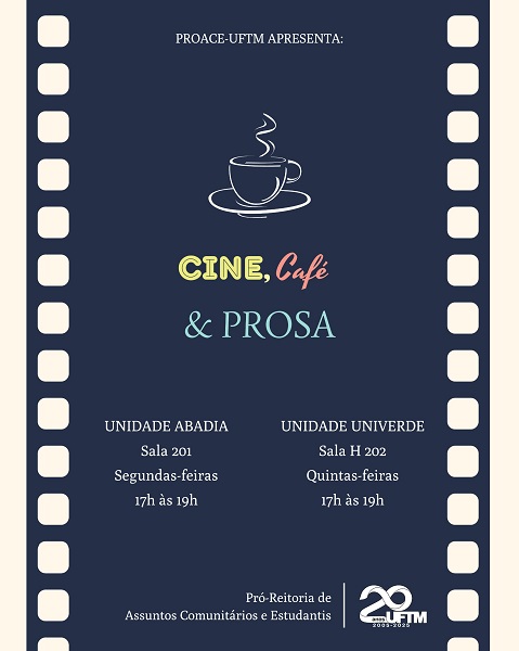 O projeto de extensão Cine, Café & Prosa, da Pró-reitoria de Assuntos Comunitários e Estudantis (PROACE), é um grupo aberto para toda a comunidade acadêmica da UFTM com objetivo de promover um espaço de diálogo, reflexões, socialização e lazer, a partir do uso de filmes e documentários sobre temas diversos, pertinentes à saúde e à qualidade de vida no contexto universitário.