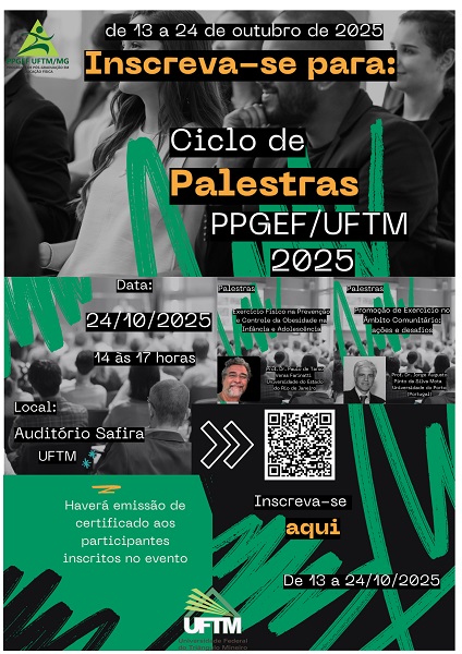 De 13 a 24 de outubro, estarão abertas as inscrições para o Ciclo de Palestras do PPGEF/UFTM 2025, com a participação de pesquisadores de destacada relevância científica nacional e internacional, com o objetivo de fortalecer a política de internacionalização da pós-graduação, fomentar a mobilidade interna e ampliar o intercâmbio acadêmico entre os programas da UFTM.