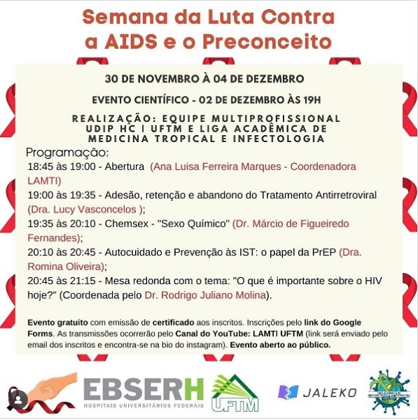 A Liga de Medicina Tropical e Infectologia e a Equipe Multiprofissional UDIP HC UFTM realizam a Semana de Luta Contra a Aids e o Preconceito do dia 30 de novembro a 4 de dezembro. O objetivo é atualizar estudantes e profissionais da saúde sobre a infecção por HIV/Aids e também promover o enfrentamento do preconceito em relação às pessoas que vivem com HIV.