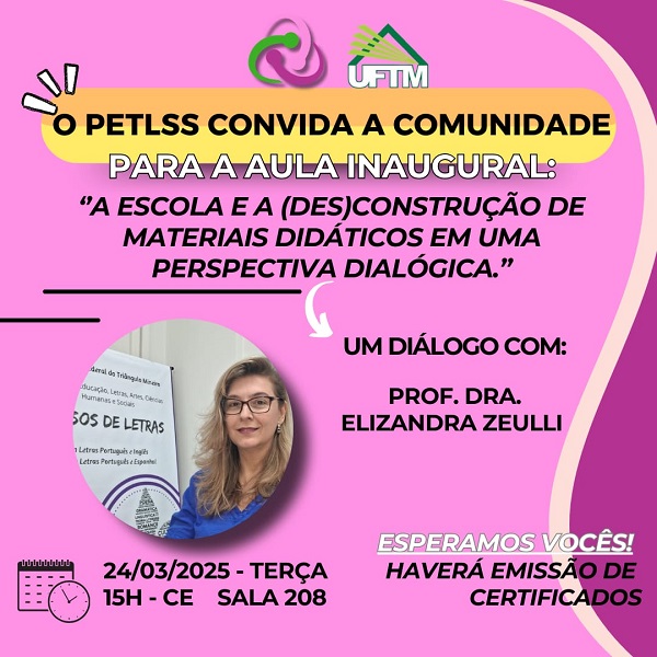 O Programa de Educação Tutorial Conexões de Saberes Licenciaturas e Serviço Social (PETLSS) e a professora Elizandra Zeulli, docente do Departamento de Letras da UFTM, realizam a Aula Inaugural "A escola e a (des)construção de materiais didáticos em uma perspectiva dialógica" no dia 24 de março, às 15 horas, na sala 208, localizada no Centro Educacional (CE) da UFTM.