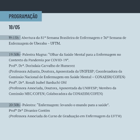 O curso de graduação em Enfermagem da UFTM organizou eventos que serão transmitidos on-line pela plataforma do Facebook para acadêmicos e profissionais da área da saúde, com ênfase na Enfermagem, nos dias 18, com início às 19h15 e 19 de maio, às 11 horas. A Semana da Enfermagem recebeu apoio do CEAD, Proens e PET Enfermagem.