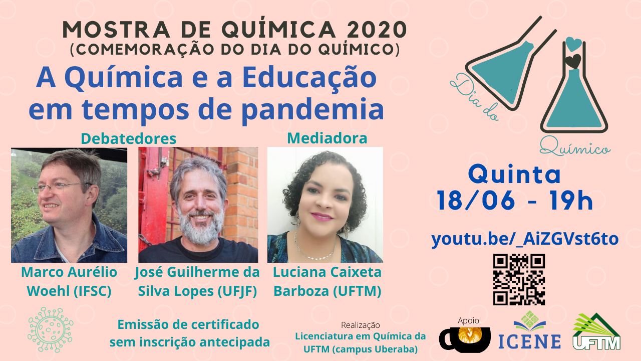 Em comemoração ao Dia do Químico, ocorrerá na UFTM, nesta quinta-feira, 18 de junho, a Mostra de Química com a mesa-redonda "A Química e a Educação em tempos de pandemia", com os professores Marco Aurélio Woehl (IFSC) e José Guilherme da Silva Lopes (UFJF). A mediadora será a professora Luciana Caixeta Barboza  da UFTM.