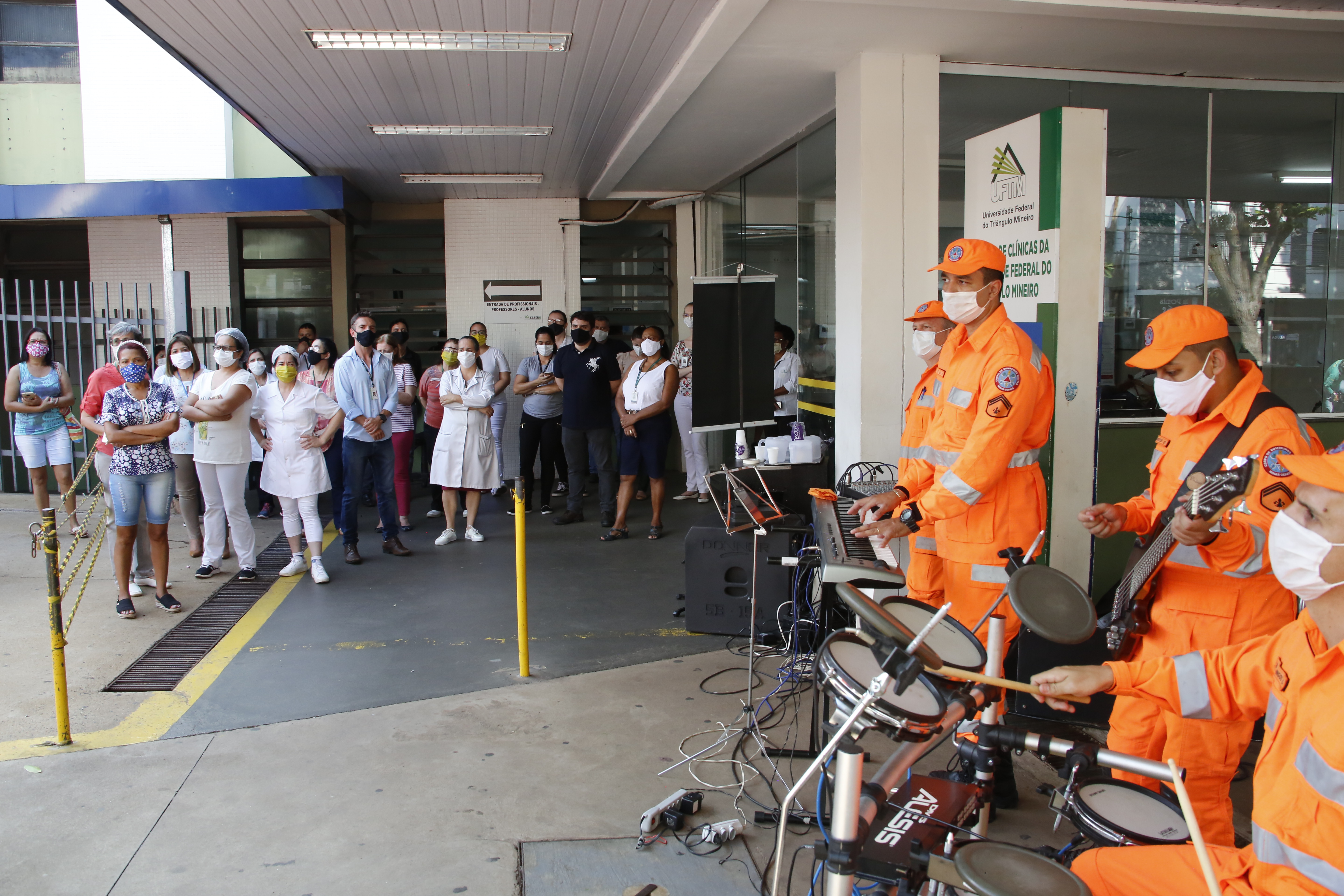 A UFTM, por meio da Pró-Reitoria de Recursos Humanos – PRORH e comissão formada por servidores de outros setores da UFTM e do Hospital de Clínicas HC-UFTM/EBSERH, iniciou nesta quarta-feira, 28 de outubro de 2020, as atividades em comemoração ao Dia do Servidor Público. Na portaria principal do HC/UFTM, os músicos do 8º Batalhão de Bombeiros Militares do estado de Minas Gerais realizaram uma breve apresentação em homenagem aos profissionais da saúde do Hospital de Clínicas da UFTM.