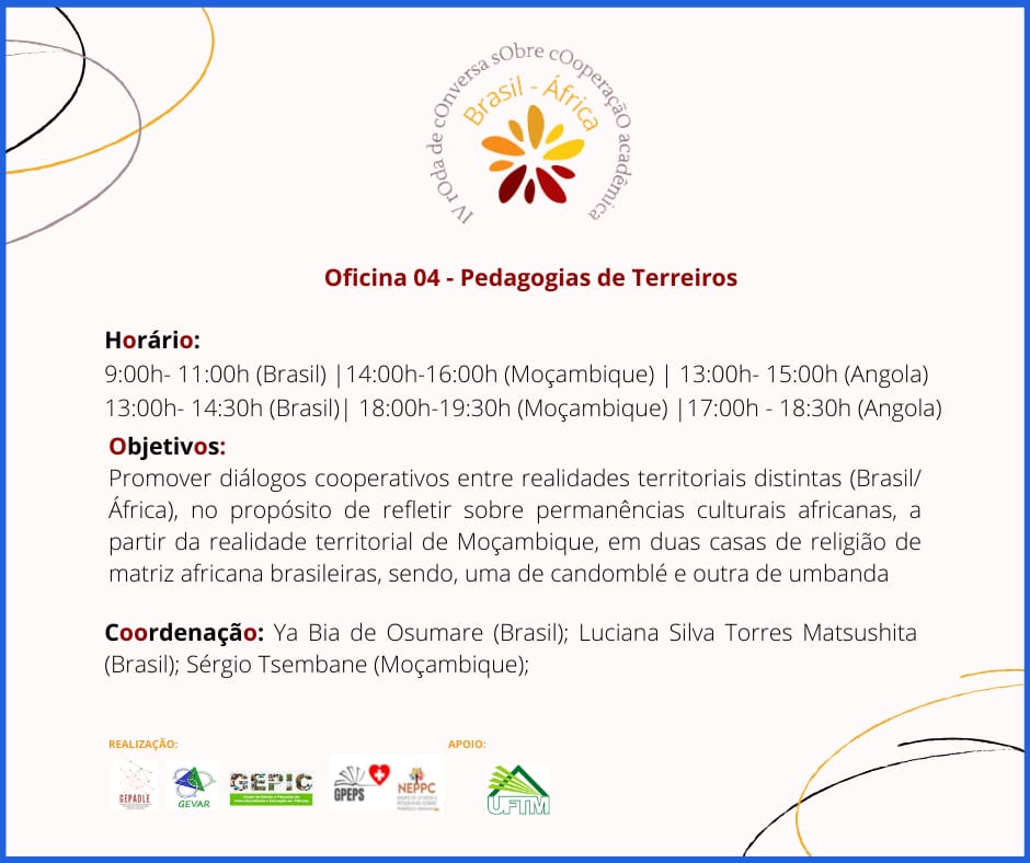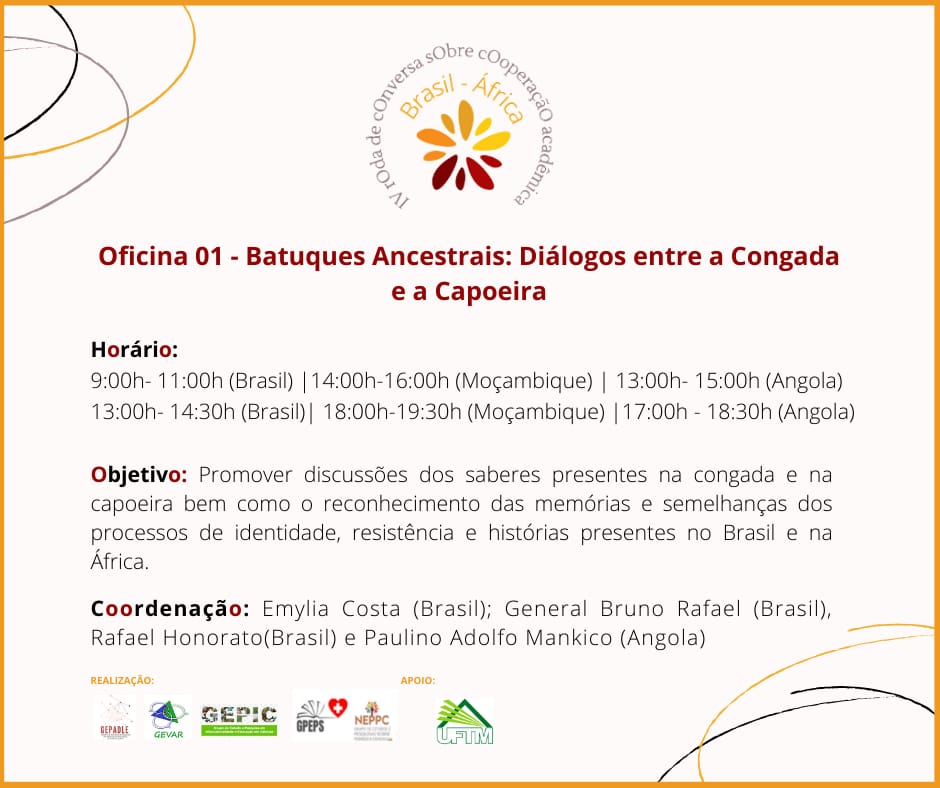 - 14h30-16h (Brasil) / 19h-21h (Moçambique): encaminhamentos das oficinas e fechamento do evento