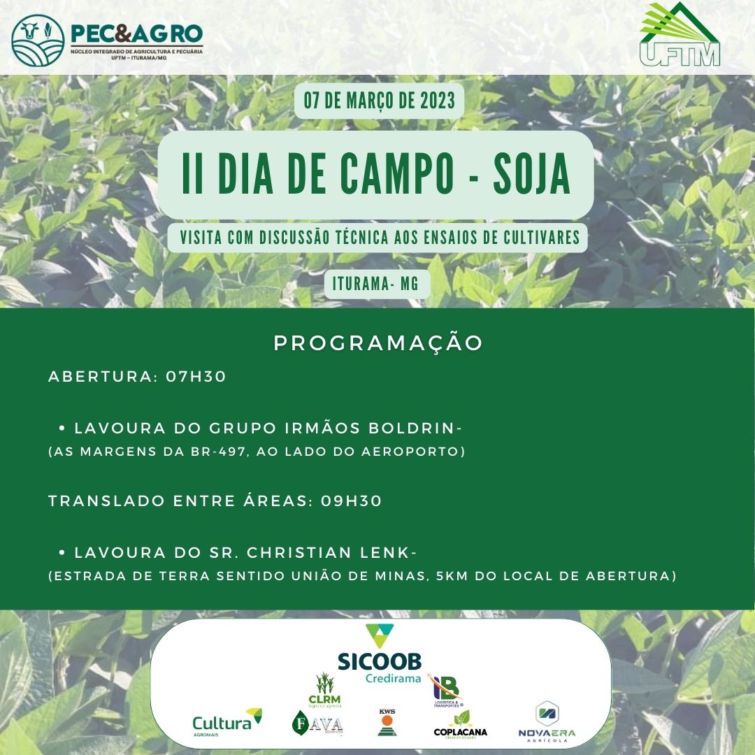 Na manhã da última terça-feira, dia 7 de março, ocorreu em Iturama o “II Dia de Campo – Soja”, organizado pelo Núcleo Integrado de Agricultura e Pecuária da UFTM, Campus Universitário de Iturama - Pec&Agro. A ação, que faz parte das atividades do Grupo de Estudo, Pesquisa e Extensão em Agricultura Tropical – GEPEAT, coordenado pelo professor Flávio Hiroshi Kaneko, ocorreu às margens da lavoura do grupo Irmãos Boldrin, na BR 497.