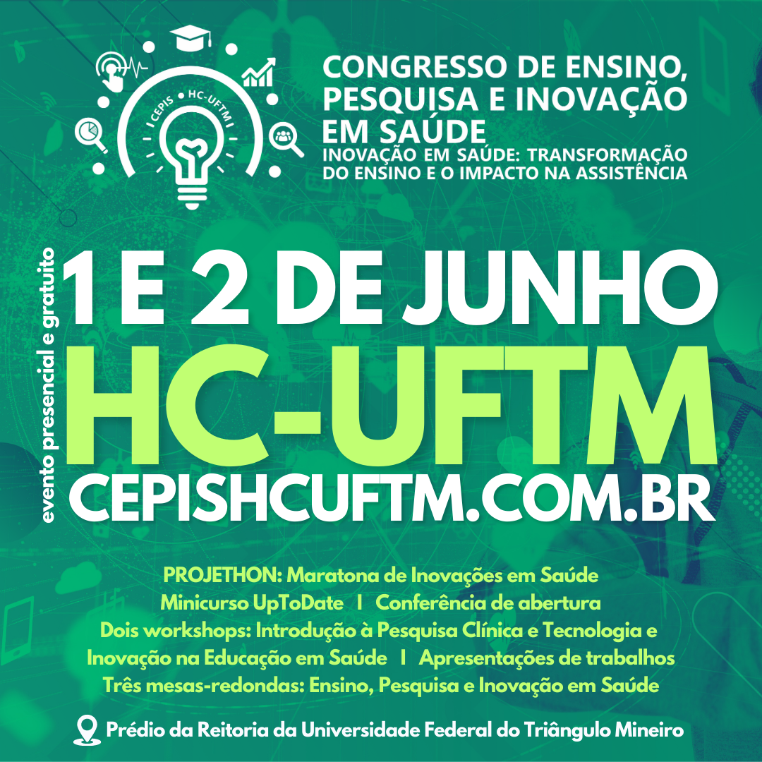 Conferências, workshops, mesas-redondas, maratona de inovação (Projethon) e apresentação de trabalhos vão compor a programação do Congresso de Ensino, Pesquisa e Inovação em Saúde (Cepis) promovido pelo Hospital de Clínicas da Universidade Federal do Triângulo Mineiro (HC-UFTM/Ebserh). O evento acontecerá nos dias 1º e 2 de junho, no prédio da Reitoria da UFTM (auditórios Esmeralda e Safira, saguão de exposições e secretaria).