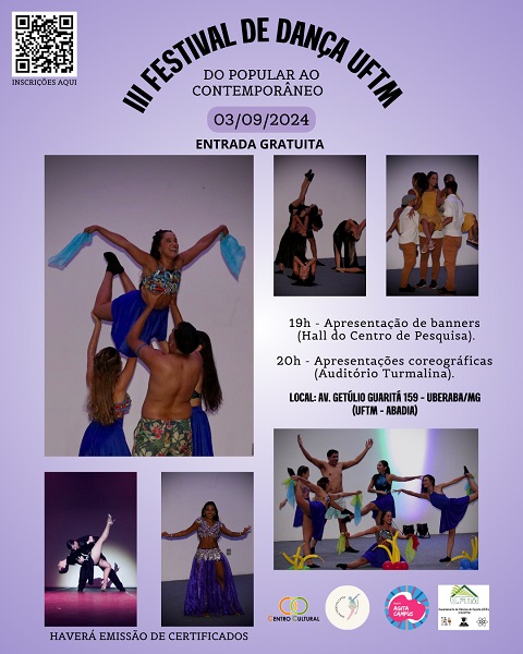 O “III Festival de Dança UFTM: do popular ao contemporâneo” acontece no dia 3 de setembro de 2024, em comemoração ao Dia do Profissional de Educação Física e da Bailarina (1º/9), com apresentações de banners às 19 horas no saguão de entrada do Centro de Pesquisa de Pesquisa Aluizio Rosa Prata, e com apresentações de dança às 20 horas no Auditório Turmalina da UFTM. As entradas serão pela Rua Vigário Carlos, nº 100 e pela Avenida Getúlio Guarita, 159, bairro Abadia, Uberaba/MG.