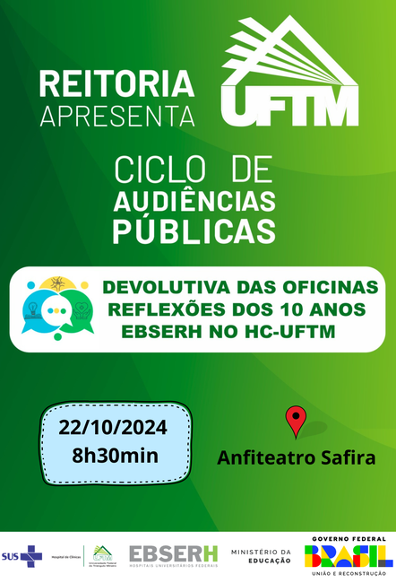 A Gestão do Hospital de Clínicas e a reitoria da Universidade Federal do Triângulo Mineiro (UFTM) convidam toda a comunidade HC-UFTM e demais interessados para a plenária “Devolutiva das oficinas reflexões dos 10 anos de Ebserh no HC-UFTM”. O evento acontecerá no dia 22 de outubro de 2024, as 08h30, no Auditório Safira, localizado no Prédio da Reitoria.