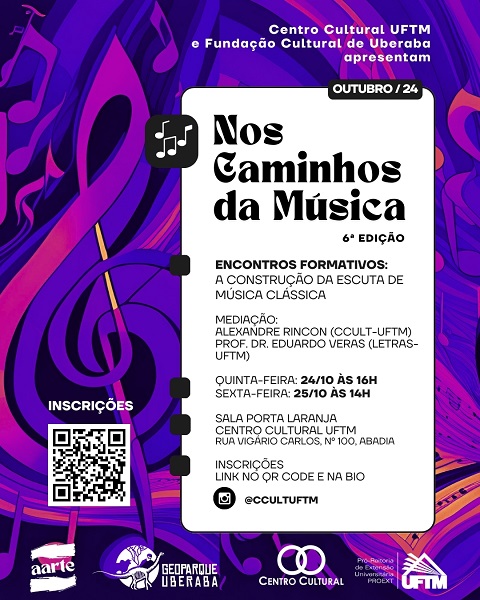 O Centro Cultural realizará antes do concerto dois encontros formativos sobre a construção da escuta de música clássica. Os encontros formativos acontecerão na quinta-feira, 24 de outubro, às 14 horas e na sexta-feira, 25 de outubro, às 16 horas, na Sala Porta Laranja do Centro Cultural. Serão conduzidos pelo técnico em música Alexandre Rincon (CCULT) e pelo professor Eduardo Veras (Letras/UFTM).